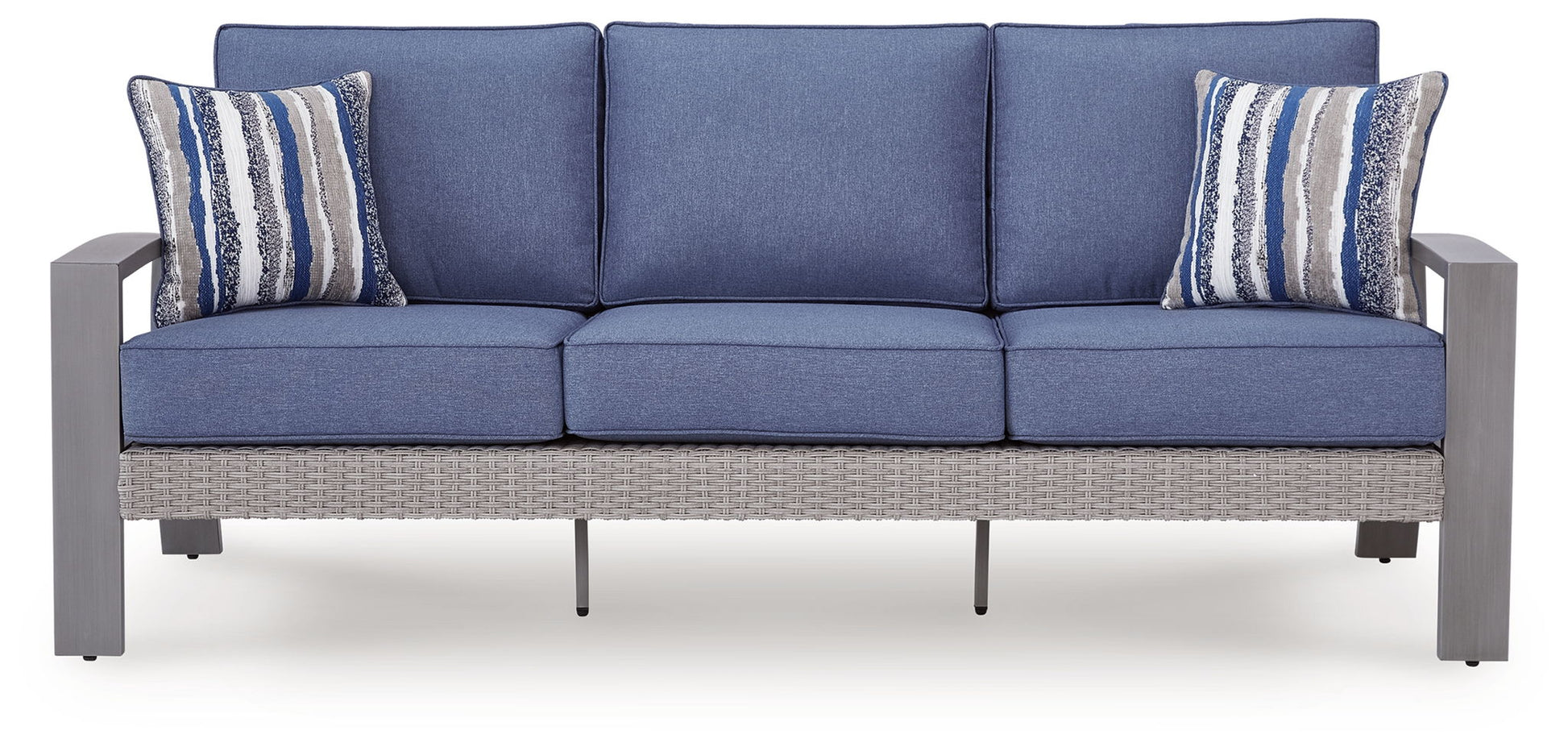 High style crafted for low-maintenance living. Turn your outdoor space into a sweet retreat with this sofa. The casually cool piece entices in an easy-breezy gray resin wicker over an all-weather aluminum frame, for an upscale aesthetic that’s downright durable. Its plush seat cushions, wrapped in high-performance Nuvella® fabric, are indulgently comfortable yet so easy to maintain. Accent pillows add delightful flair.